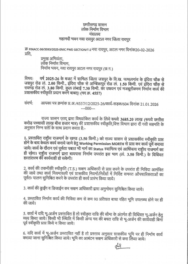 प्राप्त जानकारी के अनुसार, स्वीकृत कार्यों में इंदिरा चौक से जशपुर रोड (2.00 किमी), इंदिरा चौक से अम्बिकापुर रोड (1.50 किमी) तथा इंदिरा चौक से रायगढ़ रोड (3.80 किमी) शामिल हैं। कुल 7.30 किलोमीटर लंबाई की इन सड़कों का उन्नयन लगभग 36 करोड़ 85 लाख रुपयों से किया जाएगा,जिससे शहर की यातायात व्यवस्था सुगम होगी और नागरिकों को बेहतर आवागमन सुविधा प्राप्त होगी।